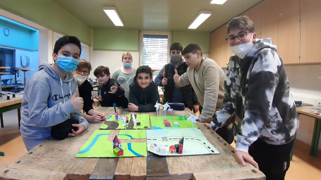 Phase 3: Abschließend bauten die Schüler:innen in Gruppen eine „grüne Modellstadt“, verknüpften diese mit dem Wissen zu erneuerbaren Energien, dass sie sich selbst aus unterschiedlichen Medien holten (Internet, Bücher,Broschüren) und präsentierten dies am Ende. Danach erfolgte eine Ergebnissicherung des Wissens, indem sie schriftlich zu 3 zentralen Fragen reflektierten: Warum müssen/sollten wir unsere derzeitige Beschaffung von Energie überdenken? Was kann ICH tun? Was hat mir das Projekt „Solar-Auto“ und die „Modellstadt“ gezeigt?